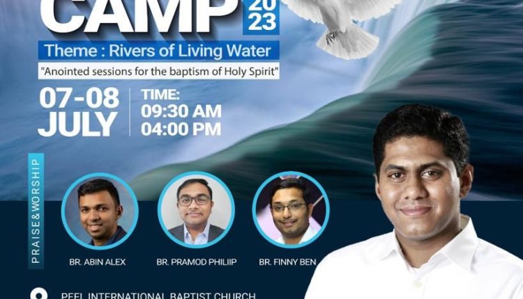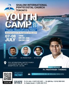 കാനഡ/ ടോറൊന്റോ: ശാലോം ഇന്റർനാഷണൽ പെന്തക്കോസ്തൽ സഭയുടെ ആഭിമുഖ്യത്തിൽ 2023 ജൂലൈ മാസം 7, 8 തീയതികളിൽ യൂത്ത് ക്യാമ്പ് നടക്കും. ബ്രാംപ്റ്റൺ പീൽ ഇൻറർനാഷണൽ ബാപ്റ്റിസ്റ്റ് ചർച്ചിൽ രാവിലെ 9.30 മുതൽ വൈകിട്ട് 4.30 വരെ നടക്കുന്ന ക്യാമ്പിൽ പാസ്റ്റർ പ്രത്യാശ് തോമസ്( യു സ് എ) മുഖ്യാതിഥി ആയിരിക്കും. “Riverse of Living Water”എന്നതാണ് ക്യാമ്പിന്റെ തീം. പാസ്റ്റർ. എബിൻ അലക്സ്, ഇവാ. പ്രമോദ് ഫിലിപ്പ്, ഇവാ. ഫിന്നി ബെൻ എന്നിവർക്കൊപ്പം ശാലോം ക്വയറും ഗാനശുശ്രുഷകൾക്ക് നേതൃത്വം കൊടുക്കും. സീനിയർ പാസ്റ്റർ കെ.എ. ജോൺ ആത്മീയ ശുശ്രുഷകൾക്കു നേതൃത്വം നൽകും.
