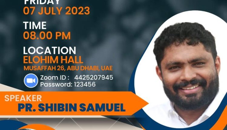 അബുദാബി: ഹെബ്റോൻ ഫെല്ലോഷിപ്പ് ചർച്ച് ഓഫ് ഗോഡ് വൈ. പി.ഇ അബുദാബി യുടെ ആഭിമുഖ്യത്തിൽ യൂത്ത് സെമിനാർ ജൂലൈ 7 വെള്ളി വൈകിട്ട് 7.30 മുതൽ എലോഹീം ഹാളിൽ വെച്ച് നടക്കും. പാസ്റ്റർ ഷിബിൻ സാമുവേൽ (പി.വൈ. പി.എ കേരള സ്റ്റേറ്റ് പ്രസിഡന്റ് ക്ലാസുകൾ നയിക്കും. പാസ്റ്റർ തോമസ് കുട്ടി ഐസക് യോഗത്തിന് നേതൃത്വം കൊടുക്കുന്നു.
