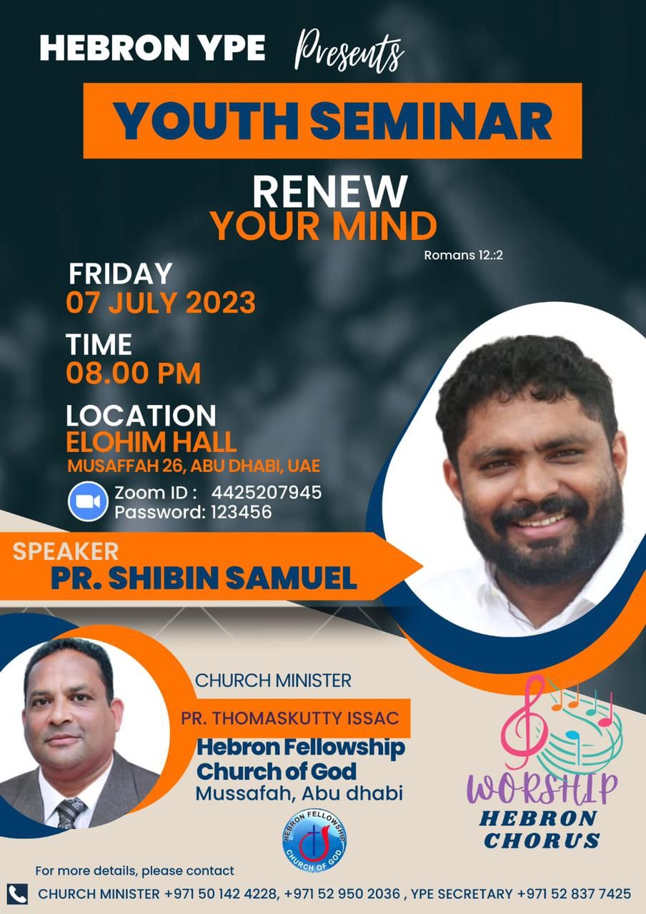 ഹെബ്റോൻ ഫെല്ലോഷിപ്പ് ചർച്ച് ഓഫ് ഗോഡ് അബുദാബി വൈ. പി.ഇ ‘Renew your Mind’ യൂത്ത് സെമിനാർ ജൂലൈ 7 ന്