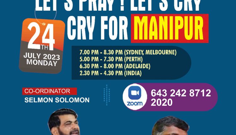 സിഡ്നി: കലാപ കൊടുംകാറ്റിൽ ആടിയുലയുന്ന മണിപ്പൂർ സംസ്ഥാനത്തിന് വേണ്ടി ഓസ്ട്രേലിയിൽ ഉള്ള ദൈവജനം പ്രാർത്ഥിക്കുവാനായി 24 ജൂലൈ തിങ്കളാഴ്ച്ച സൂമിൽ ഒന്നുചേരുന്നു . സമയം: 7 പി എം മുതൽ 9 പി എം വരെ ( മെൽബൺ , സിഡ്നി ബ്രിസ്ബേൻ ) 5 പി എം മുതൽ – 7 പി എം വരെ(ISD 2 :30 – 4 :30)വരെ. ഇവാഞ്ചലിസ്റ്റ് സെൽമോൻ സോളമൻ , ഇവാഞ്ചലിസ്റ്റ് സജോ സാം എന്നിവർ കോഓർഡിനേറ്റർ ആയി പ്രവർത്തിക്കുന്ന പ്രസ്തുത മീറ്റിംഗിൽ പാസ്റ്റർ അനിൽ കൊടിത്തോട്ടം, ഫാദർ ജോൺസൻ തേക്കടിയിൽ നിലബൂർ എന്നിവർ മുഖ്യപ്രാസംഗകർ ആയിരിക്കും.