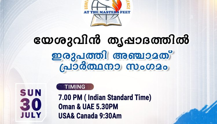 അതിരുകളില്ലാത്ത ദൈവവചനത്തിലൂടെ ദൈവസ്നേഹം അതിർവരമ്പുകളില്ലാതെ തന്നെ എല്ലാവരിലേക്കും എത്തിക്കുക എന്ന ലക്ഷ്യത്തോടെ ”യേശുവിൻ തൃപ്പാദത്തിൽ” ഇരുപത്തി അഞ്ചാമത് പ്രാർത്ഥനാ സംഗമം ജൂലൈ 30ന് ഞായറാഴ്ച ഇന്ത്യൻ സമയം രാത്രി 7.00-ന് ഓൺലൈനിൽ നടക്കും. അനുഗ്രഹീതരായ ദൈവദാസൻമാരുടെ സന്ദേശങ്ങളും ഗാനശുശ്രൂഷയും ഉണ്ടായിരിക്കും.