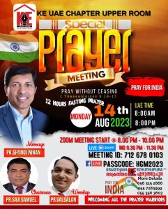 കെ ഈ. യൂ.എ.ഇ ചാപ്റ്റർ അപ്പർ റൂം ഒരുക്കുന്ന സ്വാതന്ത്ര്യദിന പ്രത്യേക പ്രാർത്ഥന ഓഗസ്റ്റ് 14 തിങ്കളാഴ്ച