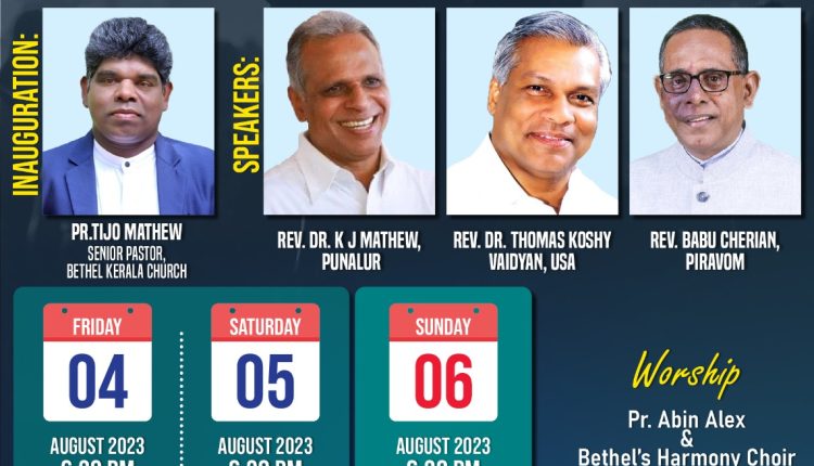 കാനഡ: കാനഡയിലെ ഒന്റാറിയോ പ്രൊവിൻസിലുള്ള ബെഥേൽ കേരള മിസ്സിസ്സാഗ, നയാഗ്ര ചർച്ചുകളുടെ വാർഷിക കൺവൻഷൻ 2023 ഓഗസ്റ്റ് 4, 5, 6 തീയതികളിൽ വൈകുന്നേരം 6:30 മുതൽ നടക്കും. ഓഗസ്റ്റ് 4, 5 തീയതികളിൽ 395 നോർത്ത് പാർക്ക് ഡ്രൈവ് എന്ന വിലാസത്തിൽ ബ്രാംപ്റ്റണിൽ വച്ചും, ആറാം തീയതി 6009 വാലി വേ നയാഗ്ര ഫോൾസ് എന്ന വിലാസത്തിൽ നയഗ്രയിൽ വച്ചും നടക്കും.