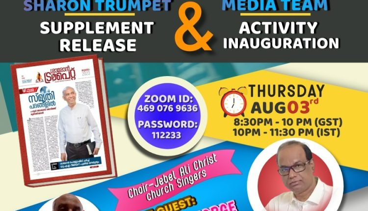 ട്രമ്പറ്റ് സപ്പ്ളിമെന്റ റീലീസ് റീജിയൻ സെക്രട്ടറി പാസ്റ്റർ ഗിൽബെർട്ട് ജോർജ് നടത്തും. ജബൽ അലി ക്രൈസ്റ്റ് സിംഗേഴ്സ് ഗാനങ്ങൾ ആലപിക്കും. പ്രസ്തുത മീറ്റിംഗിലേക്കു ഏവരെയും ഞങ്ങൾ ഹാർദ്ദവമായി സ്വാഗതം ചെയ്യുന്നു. Zoom Meeting ID: 469 076 9636 | Password: 112233