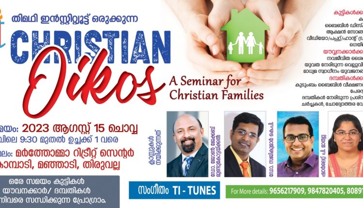 തിരുവല്ല: തിമഥി ഇന്സ്റ്റിട്യൂട്ടിന്റെ ആഭിമുഖ്യത്തില് തിരുവല്ലായിലും പരിസര പ്രദേശങ്ങളിലുമുള്ള സഭകളിലെ കുട്ടികള്, യൗവ്വനക്കാര്, ദമ്പതികള് എന്നിവര്ക്കായി ഒരുക്കുന്ന ക്രിസ്റ്റ്യന് ഓയിക്കോസ് എന്ന ഫാമിലി സെമിനാര് നാളെ 2023 ഓഗസ്റ് 15 ചൊവ്വാഴ്ച രാവിലെ 9.30 മുതല് ഉച്ചയ്ക്ക് 1 വരെ മഞ്ഞാടിക്കു സമീപമുള്ള കൊമ്പാടി മര്ത്തോമ്മ റിട്രീറ്റ് സെന്ററില് നടക്കുന്നു.