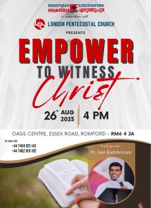 ലണ്ടനിലും പരിസരപ്രദേശത്തുമുള്ള എല്ലാ മാന്യ സഹോദരങ്ങളെയും സ്കൂൾ, യൂണിവേഴ്സിറ്റി വിദ്യാഭ്യാസം നടത്തുന്ന കുട്ടികളെയും ഞങ്ങൾ ഈ മീറ്റിങ്ങിലേക്കു സഹർഷം സ്വാഗതം ചെയ്യുന്നു. മീറ്റിംഗ് നടക്കുന്ന സ്ഥലത്തിന്റെ അഡ്രസ്സ്: London Pentecostal Church, Oasis Centre, Essex Road, Romford, Postcode: RM6 4JA.