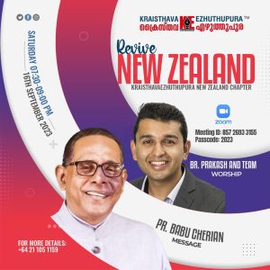 ന്യൂസീലാൻഡ്: ന്യൂസീലൻഡ് ക്രൈസ്തവ എഴുത്തുപുരയുടെ ആഭിമുഖ്യത്തിൽ റിവൈവ് ന്യൂസീലാൻഡ് സെപ്റ്റംബർ 16 ശനിയാഴ്ച ന്യൂസീലാൻഡ് സമയം രാത്രി 7.30ന് (ഇന്ത്യൻ സമയം പകൽ 1:00) സൂം പ്ലാറ്റഫോമിലുടെ നടത്തപെടുന്നു പാസ്റ്റർ ബാബു ചെറിയാൻ ദൈവ വചനത്തിൽ നിന്നു സംസാരിക്കുകയും ബ്രദർ പ്രകാശ് ജോസഫ് നയിക്കുന്ന ഗായകസംഘം ആത്മീയ ആരാധനക്ക് നേതൃത്വം നൽകും. മീറ്റിങ് ഐഡി :887 2693 3155 പാസ്വേഡ് :2023 . കൂടുതൽ വിവരങ്ങൾക്ക് പാസ്റ്റർ റോബിൻ ജോർജ് +64 21 105 1159.
