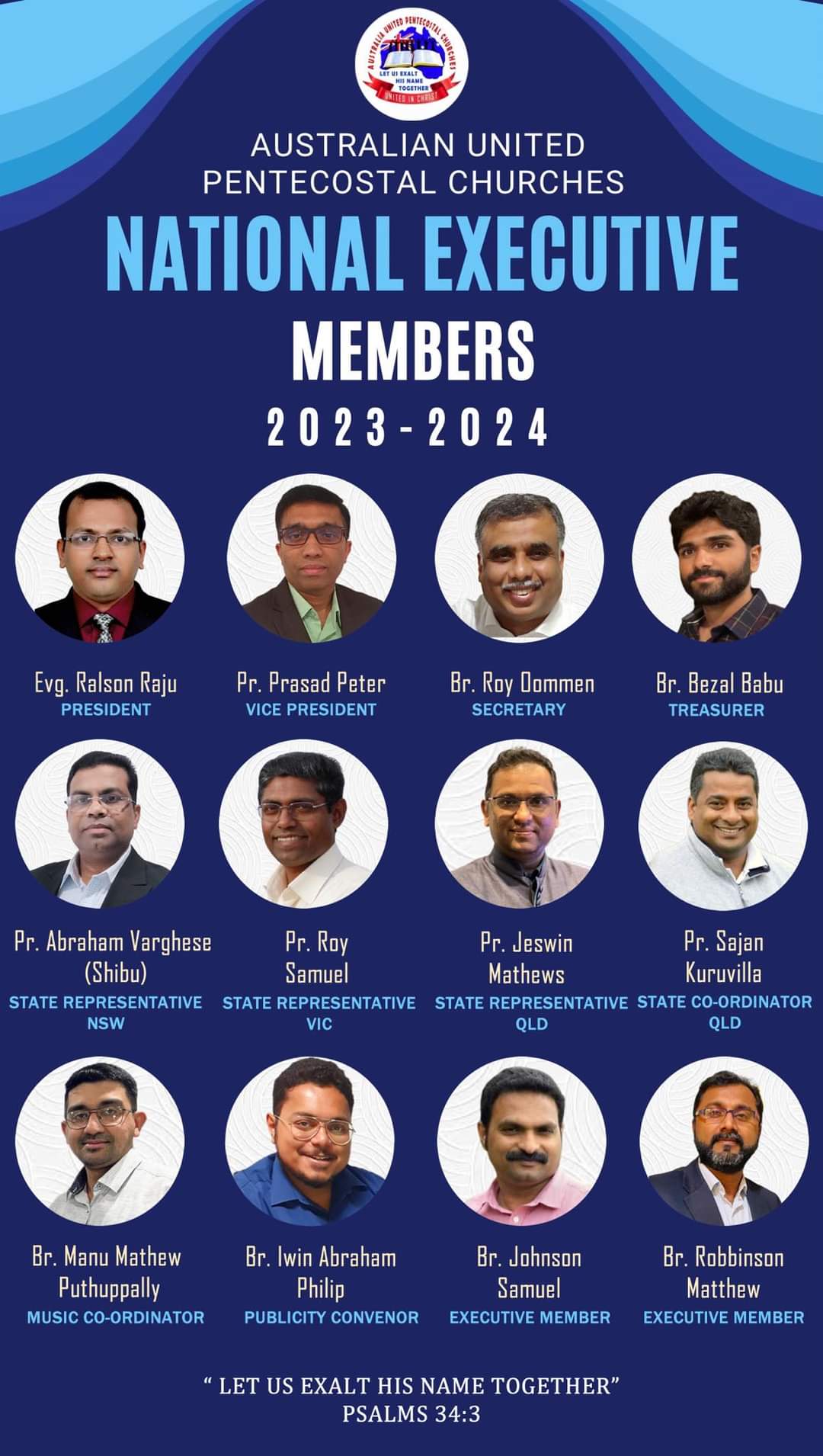 State Representative: Pr Abraham Varghese (Shibu) NSW, Pr Roy Samuel (VIC), Pr Jeswin Mathews (QLD), Pr Sajan Kuruvila (QLD).