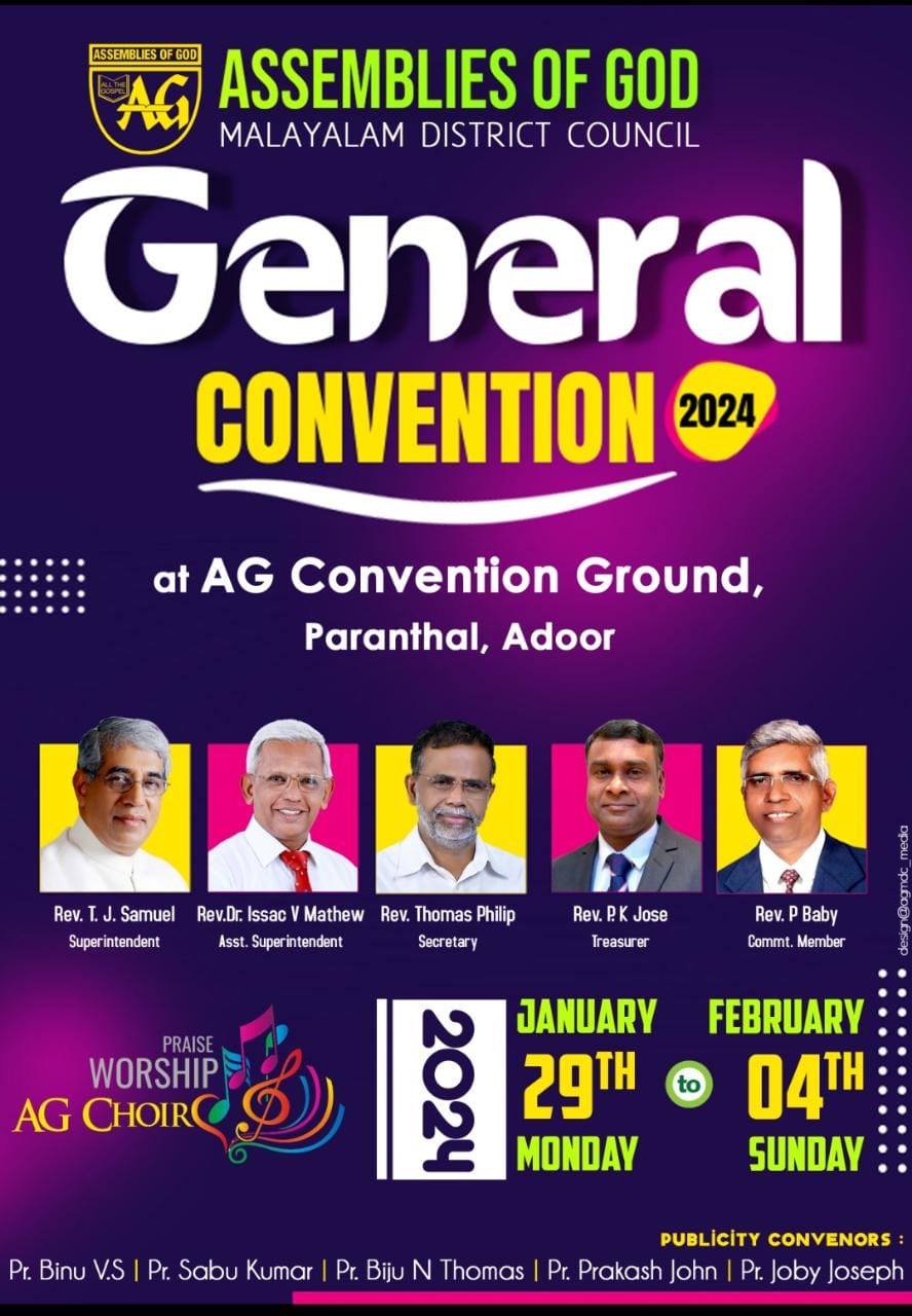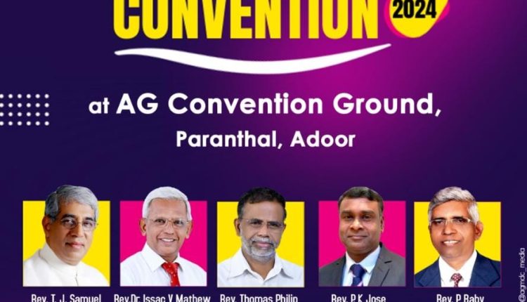 അടൂർ: അസംബ്ലീസ് ഓഫ് ഗോഡ് ജനറൽ കൺവൻഷൻ 2024 ജനുവരി 29 മുതൽ ഫെബ്രുവരി 4 വരെ പറന്തൽ എ.ജി. കൺവൻഷൻ ഗ്രൗണ്ടിൽ നടക്കും. 29 തിങ്കളാഴ്ച വൈകിട്ട് 5.30 ന് ആരംഭിക്കുന്ന പ്രാരംഭയോഗത്തിൽ സഭാ സൂപ്രണ്ട് പാസ്റ്റർ ടി.ജെ. സാമുവേൽ കൺവൻഷൻ ഉദ്ഘാടനം ചെയ്യും. സാധാരണ ചൊവ്വാഴ്ച ആരംഭിച്ചിരുന്ന കൺവൻഷൻ ഈ വർഷം തിങ്കളാഴ്ച ആരംഭിക്കും എന്ന പ്രത്യേകതയുണ്ട്.