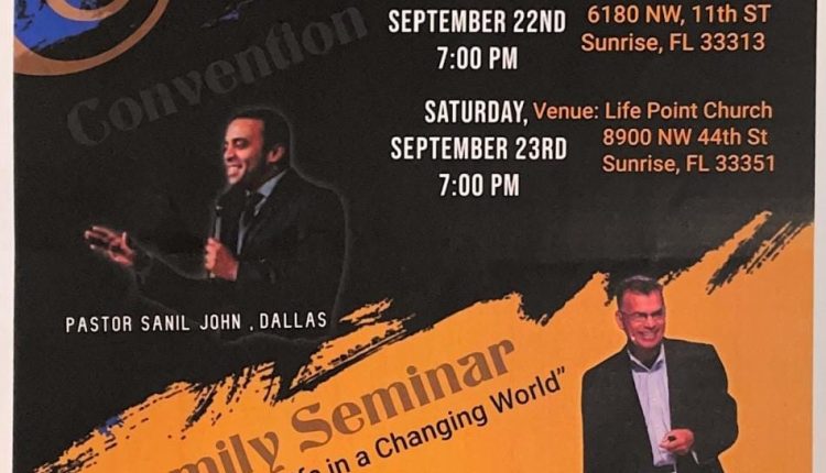 22ന് വെള്ളിയാഴ്ച വൈകിട്ട് 7 മുതൽ 9 വരെ സൺറൈസ് ഐ.പി.സി ശാലോം സഭയിലും (6180 NW 11th Street,Sunrise, FL) 23 ന് ശനിയാഴ്ച വൈകിട്ട് 7 മുതൽ 9 വരെ ലൈഫ് പോയിന്റ് ചർച്ചിലും (8900 NW 44th Street, Sunrise, FL) വച്ച് നടത്തപ്പെടുന്ന കൺവൻഷനിൽ അനുഗ്രഹീത ദൈവദാസൻ പാസ്റ്റർ സനിൽ ജോൺ ഡാളസ് ദൈവവചനം ശുശ്രൂഷിക്കും.