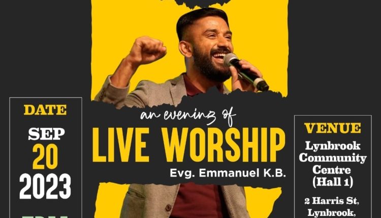 മെൽബൺ: ഫിലദെൽഫിയ ക്രിസ്ത്യൻ അസംബ്ലി ഒരുക്കുന്ന ലൈവ് വർഷിപ്പ് സെപ്റ്റംബർ 20ന് വൈകിട്ട് മെൽബൺ ലിൻബ്രൂക്ക് കമ്മ്യൂണിറ്റി സെന്ററിൽ വച്ച് നടക്കുന്നതായിരിക്കും. ഇവാഞ്ചലിസ്റ്റ് ഇമ്മാനുവൽ കെ ബി ഗാന ശുശ്രൂഷകൾക്ക് നേതൃത്വം നൽകുന്നു.