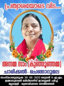 വായ്പ്പൂർ: ചെങ്ങാറുമല – ചാരിക്കൽ റവ. ഫാദർ സാം. സി. മാത്യു ( ബിലിവേഴ്സ് ഈസ്റ്റൺ ചർച്ച് ) വിന്റെ ഭാര്യ അന്നമ്മ സാം (കുഞ്ഞൂഞ്ഞമ്മ – 53) അക്കരെ നാട്ടിൽ പ്രവേശിച്ചു. പരേത മുണ്ടക്കയം – പള്ളിത്താഴെ കുടുംബാഗമാണ്. ഭൗതീകശരീരം 19.09. 2023 – ചൊവ്വാഴ്ച്ച വൈകുന്നേരം ചെങ്ങാറുമല ഭവനത്തിൽ കൊണ്ടുവരുന്നതാണ്. സംസ്കാരം 20. 09. 2023 ( ബുധനാഴ്ച ) ഭവനത്തിലെ ശുശ്രൂഷയ്ക്ക് ശേഷം രാവിലെ 11 ന് ഇമ്മാനുവേൽ ബിലിവേഴ്സ് ഈസ്റ്റൺ ചർച്ച് മല്ലപ്പള്ളി – മൂശാരികവല സെമിത്തേരിയിൽ.