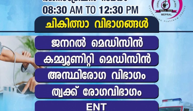 തിരുവല്ല: മേപ്രാൽ ചർച്ച് ഓഫ് ഗോഡ് ദൈവസഭയുടെ പ്ലാറ്റിനം ജൂബിലിയോട് അനുബന്ധിച്ചുള്ള മെഡിക്കൽ ക്യാമ്പ് നാളെ സെപ്റ്റംബർ 23 ശനിയാഴ്ച സഭാ അങ്കണത്തിൽ നടക്കുന്നതാണ്. തിരുവല്ല ബിലീവേഴ്സ് ചർച്ച് മെഡിക്കൽ കോളേജിലെ ഡോക്ടർമാർ ക്യാമ്പിന് നേതൃത്വം നൽകും.