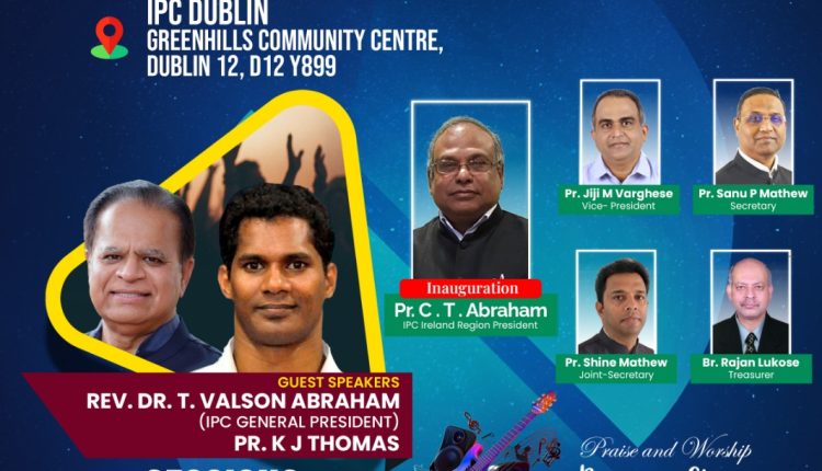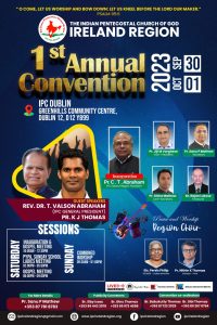ഡബ്ലിൻ : ഐപിസി അയർലൻഡ് റീജിയന്റെ വാർഷിക കൺവെൻഷൻ 2023 സെപ്റ്റംബർ 30 ഒക്ടോബർ 1 തീയതികളിൽ ഐപിസി ഡബ്ലിൻ ചർച്ചിന്റെ നേതൃത്വത്തിൽ ഗ്രീൻ ഹിൽസ് കമ്യൂണിറ്റി സെന്ററിൽ വച്ച് നടക്കും . ഐപിസി അയർലൻഡ് റീജിയൻ പ്രസിഡണ്ട് പാസ്റ്റർ സി റ്റി എബ്രഹാം ഉദ്ഘാടനം നിർവഹിക്കും.