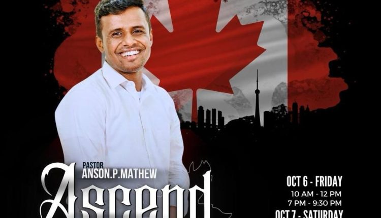 കാനഡ (ടൊറോന്റോ): Ahavah Christian Fellowship, കാനഡ സഭയുടെ ആഭിമുഖ്യത്തിൽ ഒക്ടോബർ മാസം 2-ആം തീയതി തിങ്കൾ മുതൽ 8-ആം തീയതി ഞായർ വരെ ‘അസെൻഡ്’ ഫയർ കോൺഫറൻസ് സ്കാർബോറോയിലും പീറ്റർബോറോയിലുമായി നടത്തപ്പെടുന്നു. പ്രസ്തുത യോഗത്തിൽ ഈ കാലഘട്ടത്തിന്റെ അഭിഷക്തൻ Pastor Anson P Mathew, കൊല്ലം അവറുകൾ ദൈവവചനത്തിൽ നിന്ന് ശുശ്രുഷിക്കുന്നു. ഈ ശുശ്രുഷകൾക്കു പാസ്റ്റർ ലിനോ ഇ സാമുവേൽ നേതൃത്വം നൽകുന്നു.