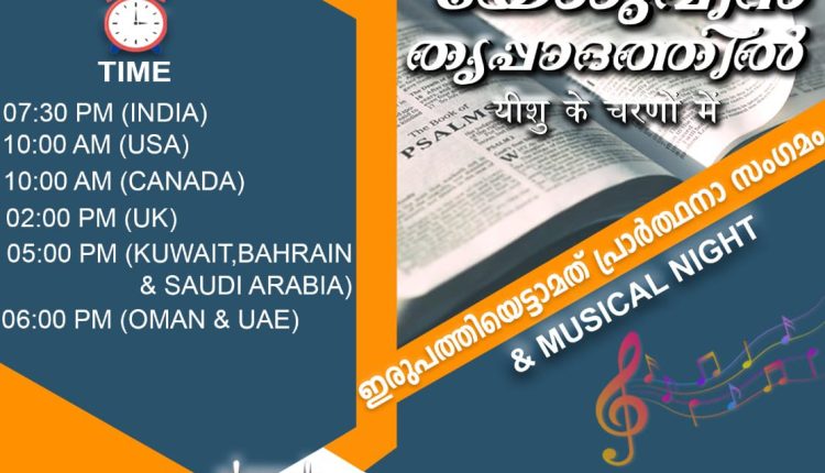 അതിരുകളില്ലാത്ത ദൈവവചനത്തിലൂടെ ദൈവസ്നേഹം അതിർവരമ്പുകളില്ലാതെ തന്നെ എല്ലാവരിലേക്കും എത്തിക്കുക എന്ന ലക്ഷ്യത്തോടെ ”യേശുവിൻ തൃപ്പാദത്തിൽ” ഇരുപത്തിയെട്ടാമത് പ്രാർത്ഥനാ സംഗമവും ഗാനസന്ധ്യയും ഒക്ടോബർ 14 ശനിയാഴ്ച ഇന്ത്യൻ സമയം രാത്രി 7.30-ന് ഓൺലൈനിൽ നടക്കും.
