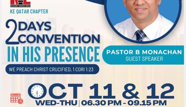 ഖത്തർ: ക്രൈസ്തവ എഴുത്തുപുര ഖത്തർ ചാപ്റ്ററിന്റെ ആഭിമുഖ്യത്തിൽ ഒക്ടോബർ 11, 12 തീയതികളിൽ വൈകിട്ട് 6.30 മുതൽ 9.15 വരെ ഐ.ഡി.സി.സി കോംപ്ലക്സ് ബിൽഡിംഗ് നമ്പർ 2 ഹാൾ നമ്പർ 5 ൽ വച്ച് ‘ഇൻ ഹിസ് പ്രസൻസ്’ എന്ന പേരിൽ ദ്വിദിന കൺവൻഷൻ നടക്കും.