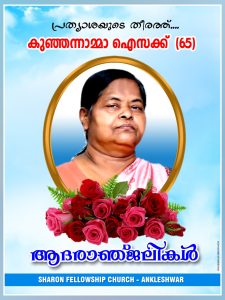 അങ്കലേശ്വർ സഭാംഗമായ ഐസക് ഇടുക്കിളയുടെ സഹധർമ്മിണി കുഞ്ഞന്നാമ്മാ ഐസക് (65) നിത്യതയിൽ ചേർക്കപ്പെട്ടു. സംസ്കാരം നാളെ 9 തിങ്കൾ രാവിലെ 10 മണിക്ക് അങ്കലേശ്വർ ശാരോൻ ചർച്ചിന്റെ നേതൃത്വത്തിൽ നടക്കും.