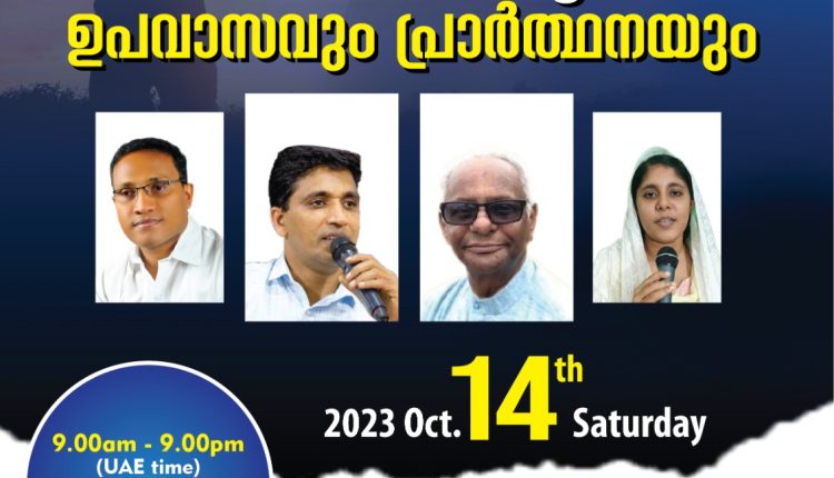 ഷാർജ : പ്രാർത്ഥനാസംഗമം (International Prayer Fellowship) ഒരുക്കുന്ന 12 മണിക്കൂർ പ്രാർത്ഥനയും ഉപവാസവും നാളെ (ഒക്ടോബർ 14 ശനിയാഴ്ച) യു.എ.ഇ സമയം രാവിലെ 9 മണി മുതൽ രാത്രി 9 മണി വരെ നടക്കും. പാസ്റ്റർ ഷൈജു ഡാനിയേൽ, പാസ്റ്റർ സുനി ഐക്കാട്, പാസ്റ്റർ കെ. ഓ. വർഗീസ്, ഷെറി ഗോഡ്സൺ, പാസ്റ്റർ ജോർജ് വർഗീസ്, എബിൻ വിൽസൺ എന്നിവർ ദൈവ വചനം ശ്രുശൂഷിക്കുകയും പാസ്റ്റർ ജയ്ലാൽ ലോറൻസ്, പാസ്റ്റർ പി. സി. മാത്യു, ബിനോയ് ലുക്കാസ്, ഷിബു ജോൺ, പാസ്റ്റർ ബിനു ജോസഫ് എന്നിവർ ആരാധനക്ക് നേതൃത്വം നൽകും.