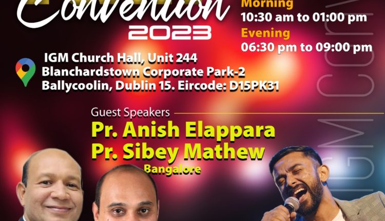 അയർലന്റ്: അയർലണ്ടിലെ ആദ്യത്തെ മലയാളി പെന്തെക്കോസ്ത് സഭയും, യൂറോപ്പിലെ തന്നെ എറ്റവും വലിയ മലയാളി പെന്തെക്കോസ്ത് സഭയുമായ ഐജിഎം ഡബ്ലിൻ ചർച്ചിന്റെ ആഭിമുഖ്യത്തിൽ വാർഷിക കൺവൻഷനും യൂത്ത് സെമിനാറും 2023 നവംബർ 2, 3, 4 തീയതികളിൽ ഐജിഎം ഡബ്ലിൻ ചർച്ച് ഹാളിൽ വെച്ച് നടത്തപ്പെടുന്നു.