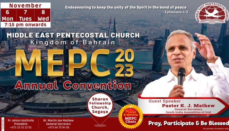 മിഡിൽ ഈസ്റ്റ് പെന്തകോസ്റ്റൽ ചർച്ച് ബഹ്റൈൻ വാർഷിക കൺവൻഷൻ നവംബർ 6 മുതൽ