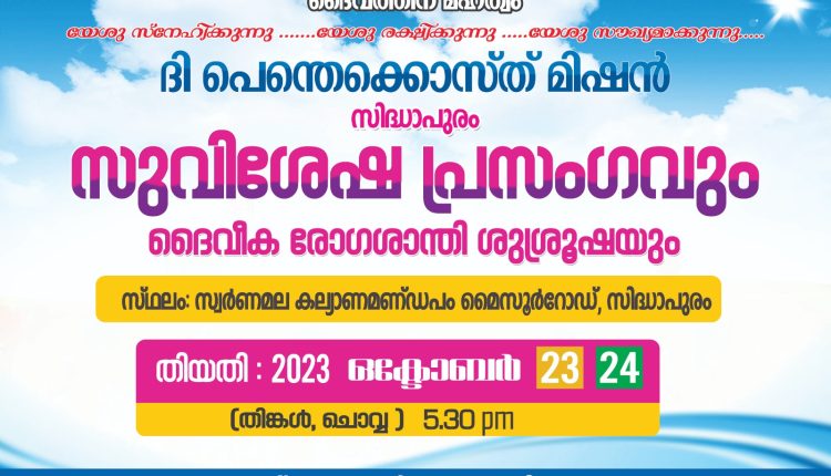 സിദ്ധാപുരം: ദി പെന്തെക്കൊസ്ത് മിഷൻ സിദ്ധാപുരം (കോഴിക്കോട് സെന്റർ) സഭയുടെ ആഭിമുഖ്യത്തിൽ സുവിശേഷ പ്രസംഗം ഒക്ടോബർ 23, 24 തീയതികളിൽ വൈകിട്ട് 5.30 ന് മൈസൂർ റോഡിൽ സ്വർണ്ണമല കല്യാണമണ്ഡപത്തിൽ നടക്കും.