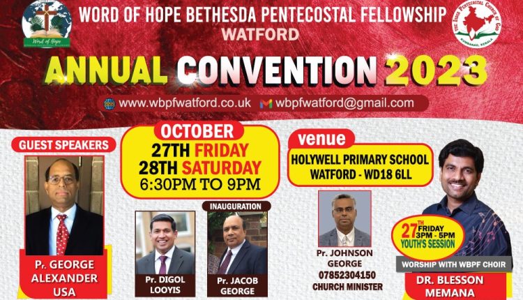വാട്ട്ഫോർഡ് : വേഡ് ഓഫ് ഹോപ് ബെഥേസ്ഥ പെന്തക്കോസ്തൽ ഫെലോഷിപ്പിൻ്റെ വാർഷിക കൺവൻഷൻ ഒക്ടോബർ 27 വെള്ളി, 28 ശനി തിയ്യതികളിൽ വൈകുന്നേരം 6.30 മുതൽ 9 മണിവരെയും യൂത്ത് സെമിനാർ ഒക്ടോബർ 27 വെള്ളി വൈകുന്നേരം 3 മണി മുതൽ 5 മണിവരെയും നടത്തപ്പെടുന്നു.