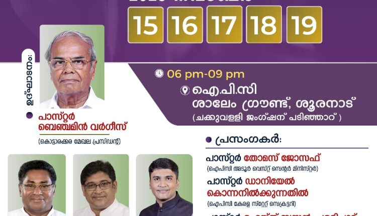 ഐപിസി കൊട്ടാരക്കര മേഖല പ്രസിഡന്റ് പാസ്റ്റർ ബെഞ്ചമിൻ വർഗീസ് ഉദ്ഘാടനം നിർവഹിക്കുന്ന കൺവെൻഷനിൽ