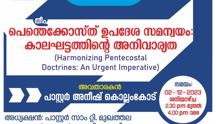 തിരുവല്ല: ശാരോൻ റൈറ്റേഴ്സ് ഫോറത്തിന്റെ ആഭിമുഖ്യത്തിൽ ‘പെന്തെക്കോസ്തു ഉപദേശ സമന്വയം: കാലഘട്ടത്തിന്റെ അനിവാര്യത’ എന്ന വിഷയത്തിൽ പ്രബന്ധ അവതരണവും ചർച്ചയും ഡിസംബർ 2ന് ഉച്ചകഴിഞ്ഞു 2.30 മുതൽ തിരുവല്ല ശാരോൻ കൺവൻഷൻ ഗ്രൗണ്ടിൽ വച്ച് നടക്കും. ചെയർമാൻ പാസ്റ്റർ സാം റ്റി മുഖത്തല അധ്യക്ഷത വഹിക്കും. ജനറൽ സെക്രട്ടറി പാസ്റ്റർ അനീഷ് കൊല്ലംകോട് പ്രബന്ധം അവതരിപ്പിക്കും.