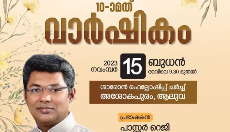 ആലുവ: ക്രിസ്ത്യൻ ലേഡീസ് ഫെലോഷിപ്പ് 10 മത് വാർഷിക കൺവൻഷൻ നവംബർ 15 ന് രാവിലെ 9.30 മുതൽ അശോകപുരം ശാരോൻ ഫെലോഷിപ്പ് സഭ ഹോളിൽ വെച്ച് നടക്കും. അനുഗ്രഹീത കൺവൻഷൻ പ്രഭാഷകൻ പാസ്റ്റർ. റെജി മാത്യു ശാസ്താംകോട്ട മുഖ്യ പ്രഭാഷണം നടത്തും.