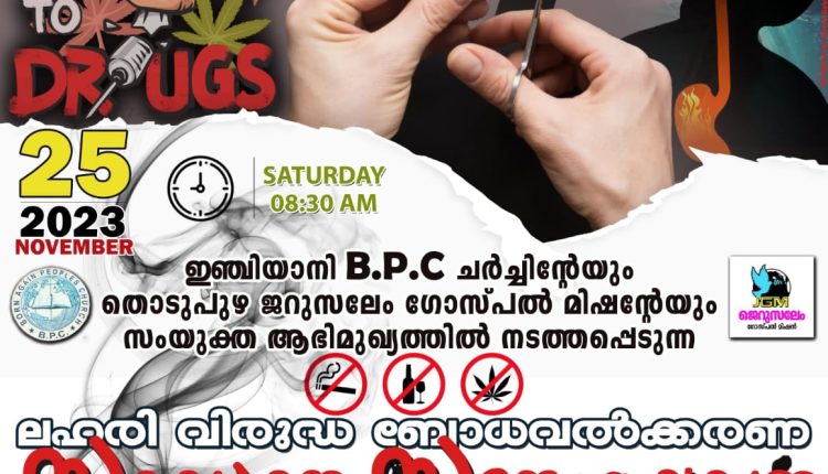 തൊടുപുഴ ജെറുസലേം ഗോസ്പൽ മിഷന്റെയും ഇഞ്ചിയാനി ബി പി സി ചർച്ചിന്റെയും നേതൃത്വത്തിൽ നാളെ (ശനി 25/11/2023) ഇഞ്ചിയാനി ചെരുവ് സിറ്റിയിൽ പകൽ ലഹരി വിരുദ്ധ സമാധാന റാലിയും സംഗീത സന്ധ്യയും നടത്തപ്പെടുന്നു. പാസ്റ്റർ കിരൺ രാജ് നെടുംങ്കണ്ടം ദൈവവചനം ശുശ്രുഷിക്കും. ജെറുസലേം വോയിസ്, തൊടുപുഴ സംഗീത ശുശ്രുഷ നിർവഹിക്കും.