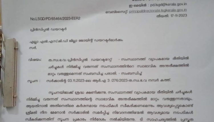 ഈ കാര്യത്തില് ആവശ്യമായ നടപടി സ്വീകരിക്കണമെന്നാവശ്യപ്പെട്ട് തദ്ദേശ പ്രിൻസിപ്പൽ ഡയറക്ടറുടെ ഓഫീസിന് സർക്കാർ പരാതി കൈമാറി. തുടർന്ന് പരാതി ജോയിന്റ് ഡയറക്ടര്ക്ക് നല്കുകയും അവര് ഈ പരാതി അന്വേഷിക്കണമെന്നാവശ്യപ്പെട്ട് എല്ലാ ജില്ലകളിലേക്കും അയക്കുകയും ചെയ്തതോടെയാണ് സംഭവം വിവാദമായത്.