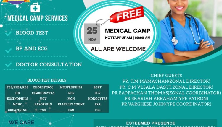YPE ട്രിവാൻഡ്രം സോണിന്റെ നേതൃത്വത്തിൽ നവംബർ 25 ന് തിരുവനന്തപുരം വിഴിഞ്ഞം കോട്ടപ്പുറം കമ്മ്യൂണിറ്റി സെന്ററിൽ വച്ച് മെഡിക്കൽ ക്യാമ്പ് നടക്കും. പ്രസ്തുത മെഡിക്കൽ ക്യാമ്പിൽ ശ്രി.വിൻസെന്റ് MLA യും സ്ഥലം കൗൺസിലറും പങ്കെടുക്കും.ഏകദേശം 2000 രൂപയോളം വരുന്ന മെഡിക്കൽ പരിശോധനകൾ വൈ.പി.ഇ ട്രിവാൻഡ്രം സോൺ സൗജന്യമായി പൊതു ജനങ്ങൾക്ക് നൽകുന്നത്.ദൈവ സഭയുടെ തിരുവനതപുരം മേഖലയുടെ ഡയറക്ടർ പാസ്റ്റർ ടി.എം മാമച്ചൻ യോഗം പ്രാർത്ഥിച്ചു ആരംഭിക്കും. വൈ.പി.ഇ തിരുവനന്തപുരം സോണൽ കമ്മറ്റി പ്രവർത്തനങ്ങൾക്ക് നേതൃത്വം നൽകുന്നു.