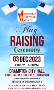 ബ്രാംപ്ടൺ: ക്രിസ്ത്യൻ ഹെറിറ്റേജ് മാസ ഫ്ലാഗ് റെയിസിംഗ് സെറിമണി ഇന്ന് (3 ഡിസംബർ 2023) 4 മണി മുതൽ 6 മണി വരെ ബ്രാംപ്ടണിൽ വച്ചു നടത്തുന്നു .
