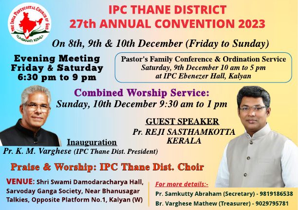 ഇന്ത്യ പെന്തക്കോസ്തു ദൈവസഭ മഹാരാഷ്ട്ര സ്റ്റേറ്റ് ,താനെ ഡിസ്ട്രിക്ട് 27-) മത് വാർഷിക കൺവെൻഷൻ ഡിസംബർ 8, 9, 10 (വെള്ളി, ശനി, ഞായർ) തീയതികളിൽ കല്യാൺ വെസ്റ്റ് റെയിൽവേ സ്റ്റേഷനു സമീപമുള്ള ശ്രീ ദാമോദരാചാര്യ ഹാളിൽ വെച്ച് നടത്തപ്പെടുന്നു. ഐപിസി താനെ ഡിസ്ട്രിക്ട് പ്രസിഡണ്ട് പാസ്റ്റർ കെ. എം. വർഗീസ് ഉത്ഘാടനം ചെയ്യുന്ന ഈ യോഗങ്ങളിൽ പാസ്റ്റർ റെജി ശാസ്താംകോട്ട മുഖ്യ പ്രാസംഗികൻ ആയിരിക്കും.