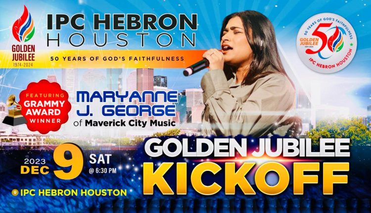 ഐ.പി.സി ഹെബ്രോന് സഭയില് നടത്തപ്പെടുന്ന കിക്കോഫ് മീറ്റിംഗില് മുഖ്യാതിഥിയായി ഗ്രാമി അവാര്ഡ് ജേതാവും പ്രശസ്ത ക്രിസ്തീയസംഗീത ഗ്രൂപ്പായ മാവറിക് സിറ്റി മ്യൂസികിന്റെ ഗായിക മേരിആന് ജോര്ജും, ബാന്ഡും സംഗീതശുശ്രൂഷ നിര്വ്വഹിക്കുന്നു. സീനിയര് പാസ്റ്റര് റവ. ഡോ. വില്സന് വര്ക്കി ഗോള്ഡന് ജൂബിലി പ്രവര്ത്തനങ്ങളുടെ ഉത്ഘാടനം നിര്വ്വഹിക്കും.
