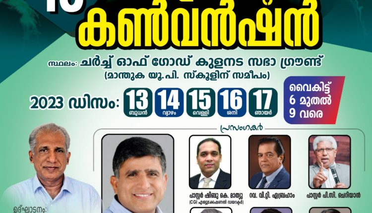 പന്തളം: ചർച്ച് ഓഫ് ഗോഡ് (ഫുൾ ഗോസ്പൽ) ഇൻ ഇന്ത്യ പന്തളം സെന്റർ കൺവൻഷൻ ഡിസംബർ 13 മുതൽ 17 വരെ മാന്തുക യു പി സ്കൂളിന് സമീപമുള്ള ചർച്ച് ഓഫ് ഗോഡ് കുളനട സഭാ ഗ്രൗണ്ടിൽ വച്ച് നടക്കും.