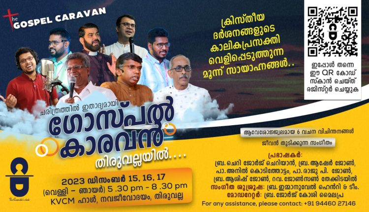 തിരുവല്ല: ക്രിസ്തീയ ദർശനങ്ങളുടെ കാലിക പ്രസക്തി വെളിപ്പെടുത്തുന്ന “ദി ഗോസ്പൽ കാരവൻ” എന്ന പ്രോഗ്രാം തിരുവല്ലയിൽ നടക്കുന്നു. ഡിസംബർ 15, 16, 17 വെള്ളി മുതൽ ഞായർ വരെ എല്ലാ ദിവസവും 5 .30 pm – 8 .30 pm വരെ. സ്ഥലം : KVCM ഹാൾ, നവജീവോദയം, തിരുവല്ല. ‘ദി കാർപെന്റെർസ് ഡെസ്ക് ‘ അവതരിപ്പിക്കുന്ന ഈ മീറ്റിംഗുകളിൽ “ദൈവം നമ്മോടു കൂടെ” (day 1), “ഭൂമിയിൽ സമാധാനം” (day 2), “ആധിപത്യം അവന്റെ തോളിൽ” (day 3) എന്നീ തീമുകൾ ചർച്ച ചെയ്യപ്പെടുന്നു. വളരെ ലളിതമായും, ആനുകാലിക പ്രസക്തിയോടും കൂടെ ദൈവവചനത്തിൽ അധിഷ്ഠിതമായ വിചിന്തനങ്ങൾ ആണ് ഈ യോഗങ്ങളിൽ ക്രമീകരിക്കപ്പെട്ടിരിക്കുന്നത് .
