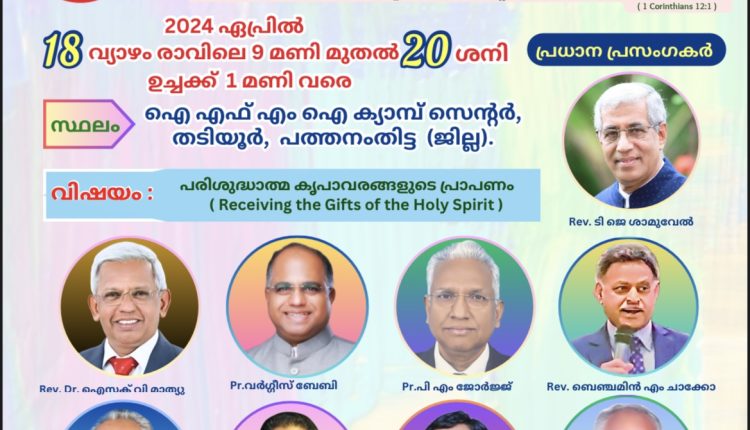 പത്തനംതിട്ട: ഇമ്മാനുവേൽ ഫെയ്ത്ത് മിനിസ്ട്രീസ് ഇന്റർനാഷനലിന്റെയും ( I F M I ) പതിനഞ്ചിൽ അധികം പെന്തക്കോസ്ത് സഭകളുടെയും സംയുക്ത ആഭിമുഖ്യത്തിൽ ഏപ്രിൽ 18 വ്യാഴം രാവിലെ 9 മണി മുതൽ 20 ശനി ഉച്ചക്ക് 1 മണി വരെ പവർ കോൺഫറൻസ് പത്തനംതിട്ട തടിയൂർ ഐ എഫ് എം ഐ ക്യാമ്പ് സെന്ററിൽ നടക്കും.
