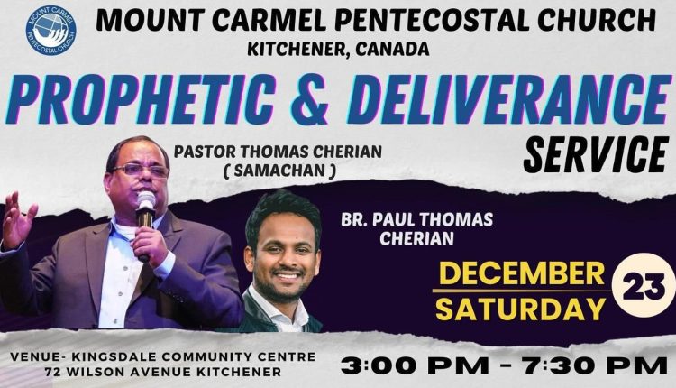 മൗണ്ട് കാർമൽ പെന്തക്കോസ്റ്റൽ ചർച്ച് കിച്ചണർ കാനഡയുടെ ആഭിമുഖ്യത്തിൽ ഡിസംബർ 23, 2023 ശനിയാഴ്ച ഉച്ചയ്ക്ക് 03:00 മുതൽ 07:30 വരെ പ്രൊഫെറ്റിക് & ഡെലിവറൻസ് സർവീസ് കിംഗ്സ്ഡെയ്ൽ കമ്യൂണിറ്റി സെന്ററിൽ (72 Wilson Avenue, Kitchener) വച്ചു നടത്തപ്പെടുന്നു.