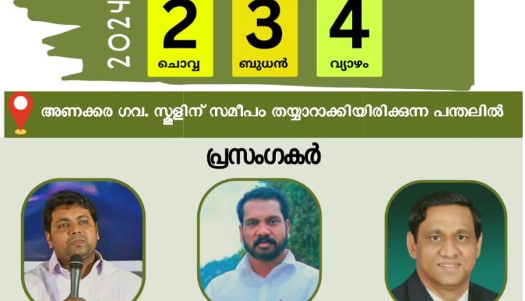 കുമളി: അണക്കര പെന്തകോസ്തൽ പ്രെയർ അസംബ്ലി 4 – മത് അണക്കര കൺവൻഷൻ ജനുവരി 2 മുതൽ അണക്കര എട്ടാം മൈൽ ഗവ.സ്കൂളിന് സമീപം തയ്യാറാക്കിയിരിക്കുന്ന പന്തലിൽ നടക്കും. പാസ്റ്റർ ബി. മോനച്ചൻ കായംകുളം, പാസ്റ്റർ സജോ തോണിക്കുഴിയിൽ, പാസ്റ്റർ അജി ആൻ്റണി റാന്നി എന്നിവർ ദൈവവചനം ശുശ്രൂഷിക്കുന്ന കൺവൻഷനിൽ ജോബിൻ എലീശാ നേതൃത്വം നൽകുന്ന ക്രൈസ്റ്റ് സിംഗേഴ്സ് തിരുവനന്തപുരം ഗാനശുശ്രൂഷ നിർവഹിക്കും. ദിവസവും വൈകുന്നേരം 5.30 മുതൽ 9 വരെ ആണ് മീറ്റിംഗ് നടക്കുന്നത്. കൺവെൻഷൻ ജനുവരി 4 ന് സമാപിക്കും. പാസ്റ്റർമാരായ തോമസ് എബ്രഹാം, സന്തോഷ് ഇടക്കര, ടി.ജെ.തോമസ്, ഐജു വി.കുര്യാക്കോസ്, മനോജ് കുളങ്ങര, ജിനു തങ്കച്ചൻ,, ബാബു ജോസഫ്, കെ.കെ. സാംകുട്ടി, സാബു ഏബ്രഹാം എന്നിവരുടെ നേതൃത്വത്തിൽ ഉള്ള വിവിധ കമ്മറ്റികൾ പ്രവർത്തിച്ചു വരുന്നു. ഈ വർഷത്തെ കൺവൻഷൻ്റെ വിപുലമായ ക്രമീകരങ്ങളുടെ ഭാഗമായി വിളംബര സുവിശേഷ യോഗങ്ങളും നടത്തി വരുന്നതായി സംഘാടകർ അറിയിച്ചു. കൺവൻഷൻ്റെ അനുഗ്രഹത്തിനായി മേഖലാ പ്രാർത്ഥന സമ്മേളനങ്ങൾ കുമളി, കൊച്ചറ, അണക്കര എന്നിവടങ്ങളിൽ നടത്തപ്പെട്ടു.