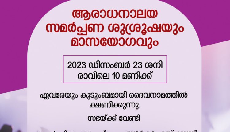 ആയൂർ: ഇന്ത്യ പെന്തകോസ്ത് ദൈവസഭ ആയൂർ സെന്ററിൽ ഉൾപ്പെട്ട ഗിൽഗാൽ അമ്പലംകുന്ന് സഭയ്ക്ക് വേണ്ടി പുതുതായി പണികഴിപ്പിച്ച ആരാധനലയത്തിന്റെയും പാഴ്സനേജിന്റെയും സമർപ്പണ ശുശ്രൂഷ 2023 ഡിസംബർ 23 രാവിലെ 10 മണിക്ക് നടക്കും.