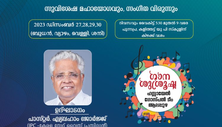 തൂക്കുകുളം: ഇന്ത്യാ പെന്തക്കോസ്ത് ദൈവസഭ ബെഥേൽ തൂക്കുകുളം സഭയുടെ ആഭിമുഖ്യത്തിൽ 2023 ഡിസംബർ 27 മുതൽ 30 വരെ ( ബുധൻ മുതൽ ശനി വരെ) വൈകുന്നേരം 5 30 മുതൽ 9 മണി വരെ പുന്നപ്ര കളിത്തട്ട് യുപി സ്കൂളിന് കിഴക്കുവശം ബ്ലെസ് പുന്നപ്ര എന്ന പേരിൽ സുവിശേഷ മഹായോഗവും സംഗീതവിരുന്നും നടത്തപ്പെടുന്നു.