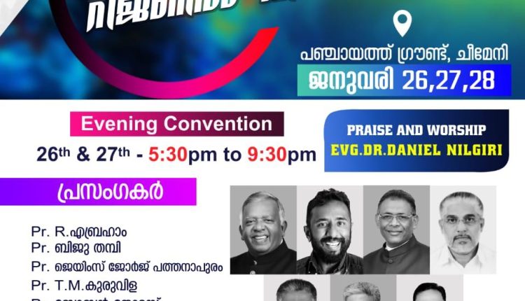ചീമേനി: ന്യൂ ഇന്ത്യ ചർച്ച് ഓഫ് ഗോഡ് നോർത്ത് മലബാർ സഭകളുടെ ആഭിമുഖ്യത്തിൽ ജനുവരി 26 മുതൽ 28 വരെ റീജിയൺ കൺവെൻഷൻ ചീമേനി പഞ്ചായത്ത് ഗ്രൗണ്ടിൽ വെച്ച് നടത്തപ്പെടുന്നു.