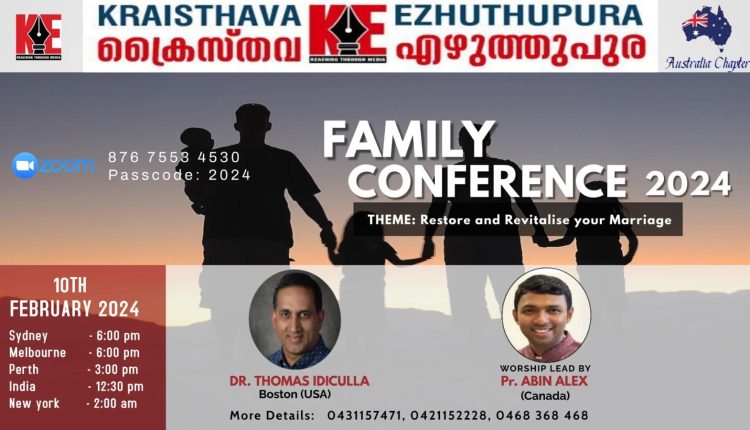 We invite you to attend the Family Conference 2024 on Saturday, February 10, at 6 pm (Sydney) and 12:30 pm (India). The guest speaker will be Dr. Thomas Idiculla, Boston (USA). Kraisthava Ezhuthupura, Australia, organizes this event.