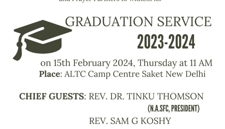 ഡൽഹി: ഫരിദാബാദ് ഫെയിത്ത് ബൈബിൾ കോളേജ് 2023-24 വർഷത്തെ ബിരുദദാന ശുശ്രൂഷ ഇന്ന് ഫെബ്രുവരി 15ന് രാവിലെ 11ന് ഡൽഹി സാകേത് ALTC ക്യാമ്പ് സെന്ററിൽ നടക്കും. റവ. ഡോ. ടിങ്കു തോംസൺ (SFC-NA പ്രസിഡന്റ്), റവ. സാം ജി കോശി (FTS മാനേജർ) തുടങ്ങിയവർ അതിഥികളായിരിക്കും. പാസ്റ്റർ എബ്രഹാം ദാനിയേൽ നേതൃത്വം നൽകും.