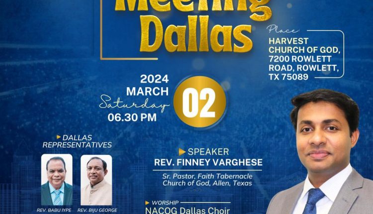 NACOG 2024 കോൺഫെറെൻസിന്റെ പ്രൊമോഷണൽ മീറ്റിംഗ്, മാർച്ച് 02ന് ഡാളസ്സിൽ നടക്കുന്നു. ഹാർവെസ്റ്റ് ദൈവവസഭയിൽ വൈകുന്നേരം 06:30 നാണ് (CST) പ്രസ്തുതയോഗം ക്രമീകരിച്ചിരിക്കുന്നത്. നോർത്ത് അമേരിക്കൻ ദൈവസഭകളുടെ കൂട്ടായ്മയായ NACOGന്റെ 27മത് മഹാസമ്മേളനത്തിന്റെ മുന്നോടിയായി അമേരിക്കൻ ഐക്യനാടുകളിലെ വിവിധ പ്രമുഖ പട്ടണങ്ങളിൽ സമാനമായ യോഗങ്ങൾ ക്രമീകരിച്ചിട്ടുണ്ട്. ഡാളസ്സിലെ പ്രസ്തുത യോഗത്തിൽ പാസ്റ്റർ ഫിന്നി വർഗ്ഗീസ് ദൈവവചനത്തിൽ നിന്നും സംസാരിക്കും. ഡാളസ് പട്ടണത്തിലെ ദൈവസഭയുടെ അംഗത്വസഭകളിൽ നിന്നുമുള്ള NACOG Dallas Choir ഗാനശുശ്രൂഷകൾക്ക് നേതൃത്വം നൽകും.