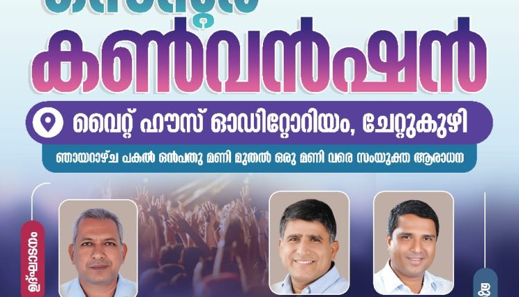 കുമളി: ഇന്ത്യ പൂർണ്ണ സുവിശേഷ ദൈവസഭ കുമളി സെന്റർ കൺവൻഷൻ ഏപ്രിൽ 11, 12, 13, 14 തീയതികളിൽ വൈകിട്ട് 6 മണി മുതൽ ചേറ്റുകുഴി- വൈറ്റ് ഹൌസ് ഓഡിറ്റോറിയത്തിൽ നടക്കും.