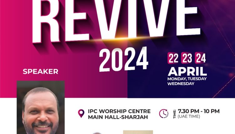 ഷാർജ്ജ: IPC ഗിൽഗാൽ ഷാർജ റാസൽ ഖൈമ ചർച്ചിന്റെ ആഭിമുഖ്യത്തിൽ റിവൈവ് 2024 കൺവൻഷൻ നടത്തപ്പെടുന്നു. 2024 ഏപ്രിൽ 22, 23, 24 (തിങ്കൾ, ചൊവ്വ, ബുധൻ ) തീയതികളിൽ വൈകിട്ട് 7:30 മുതൽ ഷാർജ്ജ വർഷിപ്പ് സെൻ്റർ മെയിൻ ഹാളിൽ നടത്തപ്പെടുന്ന യോഗങ്ങൾ IPC UAE Region പ്രസിഡണ്ട് പാസ്റ്റർ വിൽസൺ ജോസഫ് ഉത്ഘാടനം ചെയ്യും. പാസ്റ്റർ ജോൺ വർഗ്ഗീസ് അദ്ധ്യക്ഷത വഹിക്കുന്ന ഈ യോഗങ്ങളിൽ പാസ്റ്റർ ജോയി പാറക്കൽ ദൈവവചനം ശുശ്രൂഷിക്കുയും IPC ഗിൽഗാൽ Choir ഗാനശുശ്രൂഷകൾക്ക് നേതൃത്വം നൽകുന്നതുമായിരിക്കും.