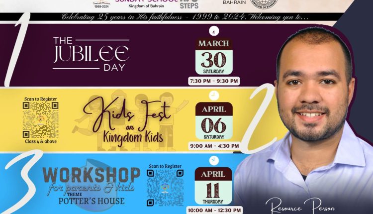 2024 മാർച്ച് 30 ന് ജൂബിലി ഡേ സ്തോത്രശുശ്രൂഷ സെഗയ എസ്. എഫ്. സി. ഹാളിൽവെച്ച് നടത്തപ്പെടും. വൈകുന്നേരം 7.30 മുതൽ നടക്കുന്ന പൊതുസമ്മേളനത്തിൽ ഇവാ. ഡേവിസ് ഏബ്രഹാം (ലക്നൗ) മുഖ്യപ്രഭാഷണം നൽകും. ബഹറിനിലെ വിവിധ സഭകളെയും സംഘടനകളെയും പ്രതിനിധീകരിച്ചു പാസ്റ്റേഴ്സും ലീഡേഴ്സും സംസാരിക്കും. കുട്ടികളുടെ വിവിധ പ്രോഗ്രാമുകളും ഉൾപ്പെടുത്തിയിട്ടുണ്ട്.